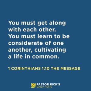 The Bible says, “You must get along with each other. You must learn to be considerate of one another, cultivating a life in common” (1 Corinthians 1:10 The Message).