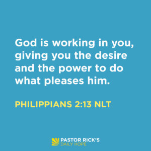 Philippians 2:13 says, “God is working in you, giving you the desire and the power to do what pleases him” (NLT).