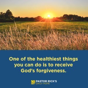 Confess your sin. One of the healthiest things you can do is to receive God’s forgiveness. Don’t repress or suppress your sin. Instead, express it to God. If you don’t talk to God about your sin, you’ll take it out on your body. This happened to David: “When I refused to confess my sin, my body wasted away, and I groaned all day long . . . My strength evaporated . . . Finally, I confessed all my sins to you and stopped trying to hide my guilt . . . And you forgave me! All my guilt is gone” (Psalm 32:3-5 NLT).