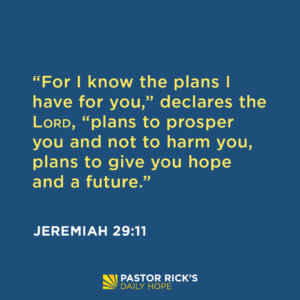 “‘For I know the plans I have for you,’ declares the LORD, ‘plans to prosper you and not to harm you, plans to give you hope and a future’” (Jeremiah 29:11 NIV).