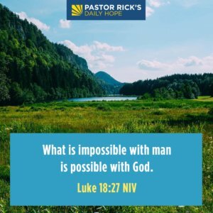 God makes the impossible possible. Anytime you use the word “impossible,” listen for laughter from heaven—because “impossible” is not in God’s book. God can do things you can’t do. He has power and resources you’ve never dreamed of having. Jesus says, “What is impossible with man is possible with God” (Luke 18:27 NIV).