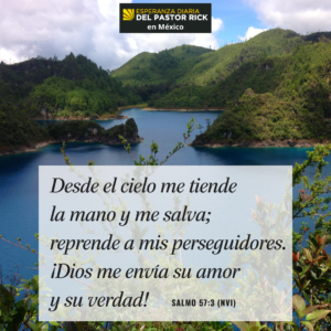 “Desde el cielo me tiende la mano y me salva; reprende a mis perseguidores. ¡Dios me envía su amor y su verdad!”. Salmo 57:3 (NVI)