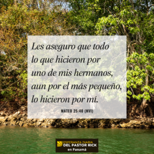 “Y le contestarán los justos: “Señor, ¿cuándo te vimos hambriento y te alimentamos, o sediento y te dimos de beber? ¿Cuándo te vimos como forastero y te dimos alojamiento, o necesitado de ropa y te vestimos? ¿Cuándo te vimos enfermo o en la cárcel y te visitamos?” El Rey les responderá: ‘Les aseguro que todo lo que hicieron por uno de mis hermanos, aun por el más pequeño, lo hicieron por mí’ ”. Mateo 25:37-40 (NVI)