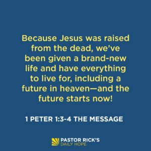 “Because Jesus was raised from the dead, we’ve been given a brand-new life and have everything to live for, including a future in heaven—and the future starts now!”