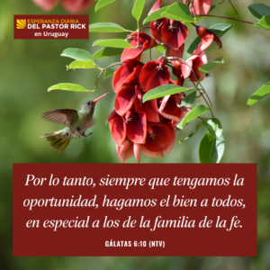 Gálatas 6:10 dice, “Por lo tanto, siempre que tengamos la oportunidad, hagamos el bien a todos, en especial a los de la familia de la fe” (NTV).