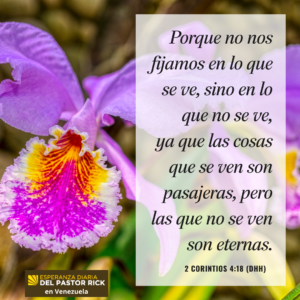 “Así que no nos fijamos en lo visible, sino en lo invisible, ya que lo que se ve es pasajero, mientras que lo que no se ve es eterno”. 2 Corintios 4:18 (NVI)