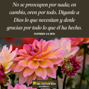 “No se preocupen por nada; en cambio, oren por todo. Díganle a Dios lo que necesitan y denle gracias por todo lo que él ha hecho” Filipenses 4:6 (NTV).