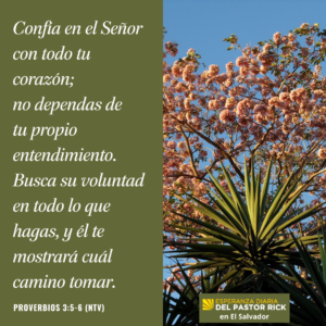 “Confía en el Señor con todo tu corazón; no dependas de tu propio entendimiento. Busca su voluntad en todo lo que hagas, y él te mostrará cuál camino tomar”. Proverbios 3:5-6 (NTV)