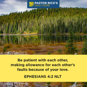 “Be patient with each other, making allowance for each other’s faults because of your love” (Ephesians 4:2 NLT).