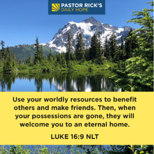 Luke 16:9 is a verse that most people don’t understand. Jesus says, “Use your worldly resources to benefit others and make friends. Then, when your possessions are gone, they will welcome you to an eternal home” (NLT).