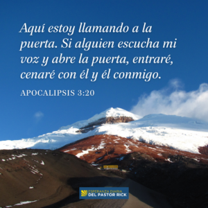 “Mira, aquí estoy llamando a la puerta. Si alguien escucha mi voz y abre la puerta, entraré, cenaré con él y él conmigo”. Apocalipsis 3:20 (PDT)