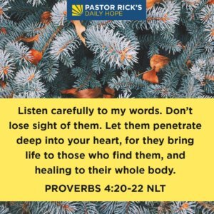 “Listen carefully to my words. Don’t lose sight of them. Let them penetrate deep into your heart, for they bring life to those who find them, and healing to their whole body.”