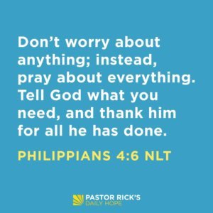 The Bible tells you, “Don’t worry about anything; instead, pray about everything. Tell God what you need, and thank him for all he has done. Then you will experience God’s peace, which exceeds anything we can understand. His peace will guard your hearts and minds as you live in Christ Jesus” (Philippians 4:6-7 NLT).