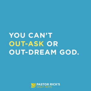 Did you know that you can’t out-ask or out-dream God? The Bible says, “[God] is able to do immeasurably more than all we ask or imagine, according to his power that is at work within us” (Ephesians 3:20 NIV). Go ahead and stretch your imagination to the greatest thing that could possibly happen—and then realize that God can go beyond that.