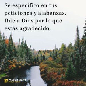 La Biblia nos invita a ser específicos en nuestras peticiones y nuestras alabanzas. En lugar de un simple “gracias por todo”, quiere que le digamos por lo que estamos agradecidos. Cuando le digo a mi esposa: “Estoy muy agradecida por ti”, me dice que sea específico. Le gusta escuchar lo que aprecio de ella y lo que le agradezco. Dios también lo hace. Entonces, cuando ores, dile a Dios por lo que estás agradecido.