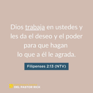 Filipenses 2:13 dice: “Dios trabaja en ustedes y les da el deseo y el poder para que hagan lo que a él le agrada” (NTV).