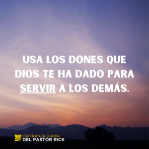 ¿Te has preguntado cuál es tu propósito? ¿Cómo crees que tus dones y talentos se relacionan con ese propósito?¿De qué manera puedes usar tus talentos y dones para ayudar a alguien esta semana?Si supieras que Jesús regresa en tres días, ¿cómo invertirías estos días? ¿De qué manera esa perspectiva cambiaría la forma en que usas tu tiempo todos los días?Si todavía no has confiado en Jesús y no te has comprometido a seguirlo, ¿por qué esperar más? Si estás listo para cruzar esa línea y tomar la decisión de creer en Jesucristo y seguirlo, haz esta oración .The post Tus Dones y Talentos no son solo para tu Propio Bien appeared first on Pastor Rick's Daily Hope.