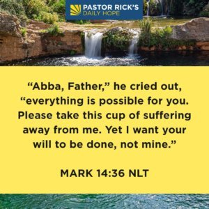 Mark 14:36 says, “‘Abba, Father,’ he cried out, ‘everything is possible for you. Please take this cup of suffering away from me. Yet I want your will to be done, not mine’” (NLT).