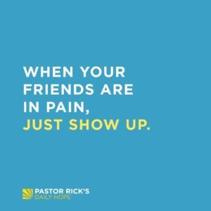 That’s a good example to remember. When your friends are in pain, just show up. The deeper the pain, the fewer words you use. It’s called the ministry of presence. You don’t have to say anything; you just need to be there.