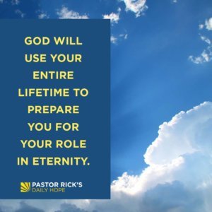 But remember this: God is never in a hurry, but he is always on time. He will use your entire lifetime to prepare you for your role in eternity.
