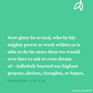 Ephesians 3:20 says, “Now glory be to God, who by his mighty power at work within us is able to do far more than we would ever dare to ask or even dream of—infinitely beyond our highest prayers, desires, thoughts, or hopes” (TLB).