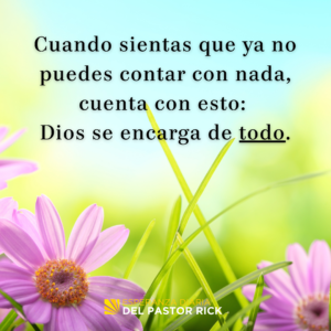 Aunque la situación puede parecer fuera de control y lo que estás pasando puede ser doloroso, nada está fuera del control de Dios. Sé paciente. El tiempo de Dios es perfecto. Él nunca llega tarde. Él está en control.
