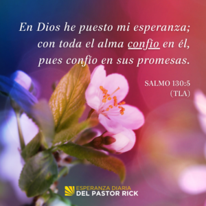 Necesitas estar expectante mientras confías en que Dios actuará y proveerá. Salmo 130:5 dice: “En Dios he puesto mi esperanza; con toda el alma confío en él, pues confío en sus promesas” (TLA). Esa promesa está en toda la Biblia, en versículos como Isaías 49:23, “Los que en mí esperan no serán avergonzados jamás” (NBV).