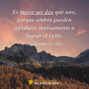 La Biblia dice: “Es mejor ser dos que uno, porque ambos pueden ayudarse mutuamente a lograr el éxito. Si uno cae, el otro puede darle la mano y ayudarle; pero el que cae y está solo, ese sí que está en problemas” Eclesiastés 4:9-10 (NTV).