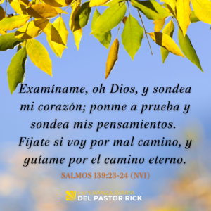 “Examíname, oh Dios, y sondea mi corazón; ponme a prueba y sondea mis pensamientos. Fíjate si voy por mal camino, y guíame por el camino eterno”. Salmos 139:23-24 (NVI)