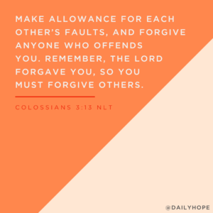 “Make allowance for each other’s faults, and forgive anyone who offends you. Remember, the Lord forgave you, so you must forgive others.”