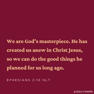 “We are God’s masterpiece. He has created us anew in Christ Jesus, so we can do the good things he planned for us long ago.”