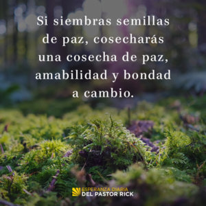 Cuando siembras una semilla, siempre obtienes más de aquello con lo que comenzaste. Si siembras una semilla de manzana, obtienes todo un árbol lleno de manzanas como recompensa. Es la ley de la siembra y la cosecha. Si siembras una semilla de conflicto, terminarás con muchos más problemas de los que buscabas. Pero la Biblia dice que, si siembras semillas de paz, cosecharás una cosecha de paz, amabilidad y bondad a cambio.