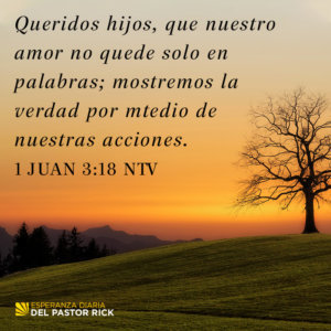 “Queridos hijos, que nuestro amor no quede solo en palabras; mostremos la verdad por medio de nuestras acciones”. 1 Juan 3:18 (NTV)