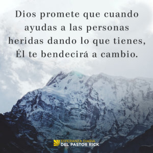 Pero Dios promete que cuando ayudas a la gente lastimada, dándoles lo que tienes, Él te bendecirá a cambio. La Biblia dice, “Alimenten a los hambrientos y ayuden a los que están en apuros. Entonces su luz resplandecerá desde la oscuridad, y la oscuridad que los rodea será tan radiante como el mediodía. El Señor los guiará continuamente, les dará agua cuando tengan sed y restaurará sus fuerzas. Serán como un huerto bien regado, como un manantial que nunca se seca” Isaías 58:10-11 (NTV).