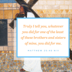 Jesus says, when you serve others, you’re serving him. So, when you want to do something for Jesus, look for people around you who are in need. Jesus said, “Truly I tell you, whatever you did for one of the least of these brothers and sisters of mine, you did for me” (Matthew 25:40 NIV).