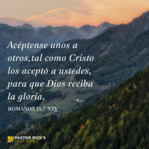 Romanos 15:7 dice, “Por lo tanto, acéptense unos a otros, tal como Cristo los aceptó a ustedes, para que Dios reciba la gloria” (NTV).