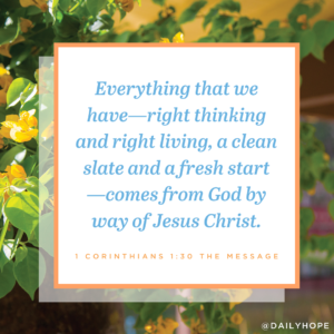 The apostle Paul said it a different way: “Everything that we have—right thinking and right living, a clean slate and a fresh start—comes from God by way of Jesus Christ” (1 Corinthians 1:30 The Message).
