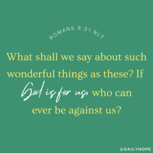 “What shall we say about such wonderful things as these? If God is for us, who can ever be against us?” (Romans 8:31 NLT).