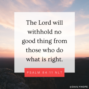 Most of us don’t really understand this, so we don’t pray for it. One of my favorite verses in the Bible is Psalm 84:11: “The Lord will withhold no good thing from those who do what is right” (NLT).