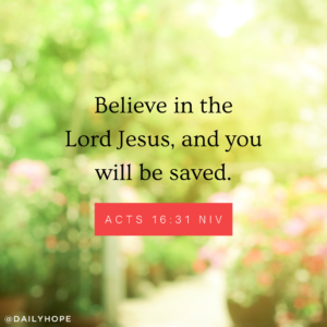 The Bible says in Acts 16:31, “Believe in the Lord Jesus, and you will be saved” (NIV).
