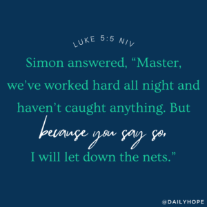 Luke 5:4-5 says, “When [Jesus] had finished speaking, he said to Simon, ‘Put out into deep water, and let down the nets for a catch.’ Simon answered, ‘Master, we’ve worked hard all night and haven’t caught anything. But because you say so, I will let down the nets’” (NIV).