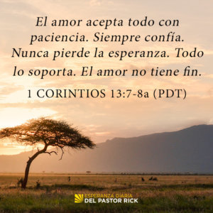 “ El amor acepta todo con paciencia. Siempre confía. Nunca pierde la esperanza. Todo lo soporta. El amor no tiene fin ”. 1 Corintios 13:7-8a (PDT)