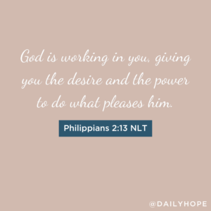 Philippians 2:13 says, “God is working in you, giving you the desire and the power to do what pleases him” (NLT).