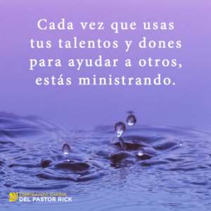¿Cómo saber cuál es tu ministerio? Mira tus talentos, dones y habilidades. Cuando usas esos talentos y dones para ayudar a otras personas, a eso se le llama ministerio —nada lujoso o aterrador. Sólo es ayudar a otros. ¿Puedes ser un ministro en el departamento de ventas? ¿Puedes ser un ministro como contador? Por supuesto. ¿Conduciendo un camión? claro que si. Cada vez que estás ayudando a otras personas en el nombre de Dios, estás ministrando.