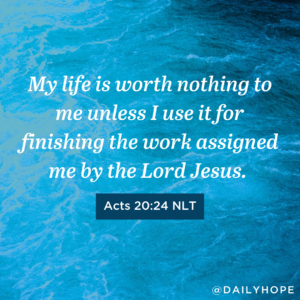 The Bible tells you exactly what you should be doing with your time: “My life is worth nothing to me unless I use it for finishing the work assigned me by the Lord Jesus” (Acts 20:24 NLT).