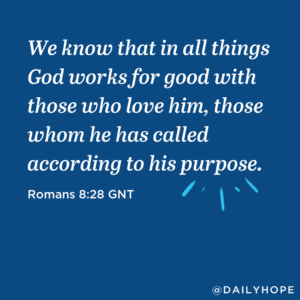 The Bible says in Romans 8:28: “We know that in all things God works for good with those who love him, those whom he has called according to his purpose” (GNT).