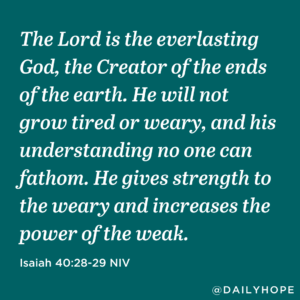 “Do you not know? Have you not heard? The LORD is the everlasting God, the Creator of the ends of the earth. He will not grow tired or weary, and his understanding no one can fathom. He gives strength to the weary and increases the power of the weak.”