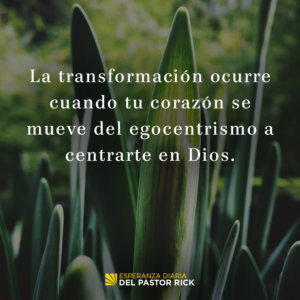 La verdadera transformación ocurre cuando tu corazón se mueve del egocentrismo a centrarse en Dios. Esta transformación no ocurre de la noche a la mañana. Toma un tiempo. Pero la buena noticia es que Dios trabajará contigo toda tu vida.