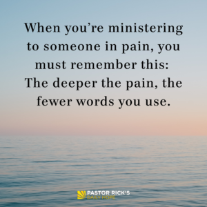 This is called the ministry of presence. When you’re ministering to someone in pain, you must remember this: The deeper the pain, the fewer words you use. If somebody’s having a bad hair day, then you can talk about it for 30 minutes. But if that person has a major crisis, talking about it for a long time is probably not going to help.