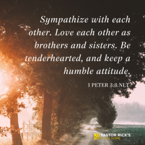 “Sympathize with each other. Love each other as brothers and sisters. Be tenderhearted, and keep a humble attitude” (1 Peter 3:8 NLT).